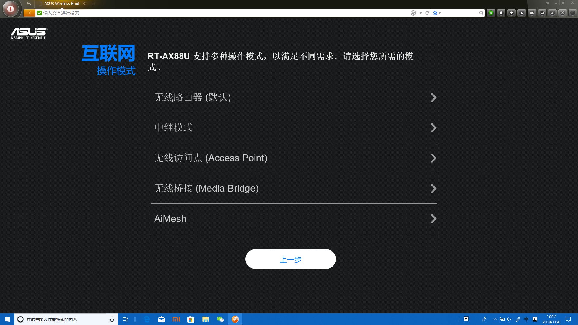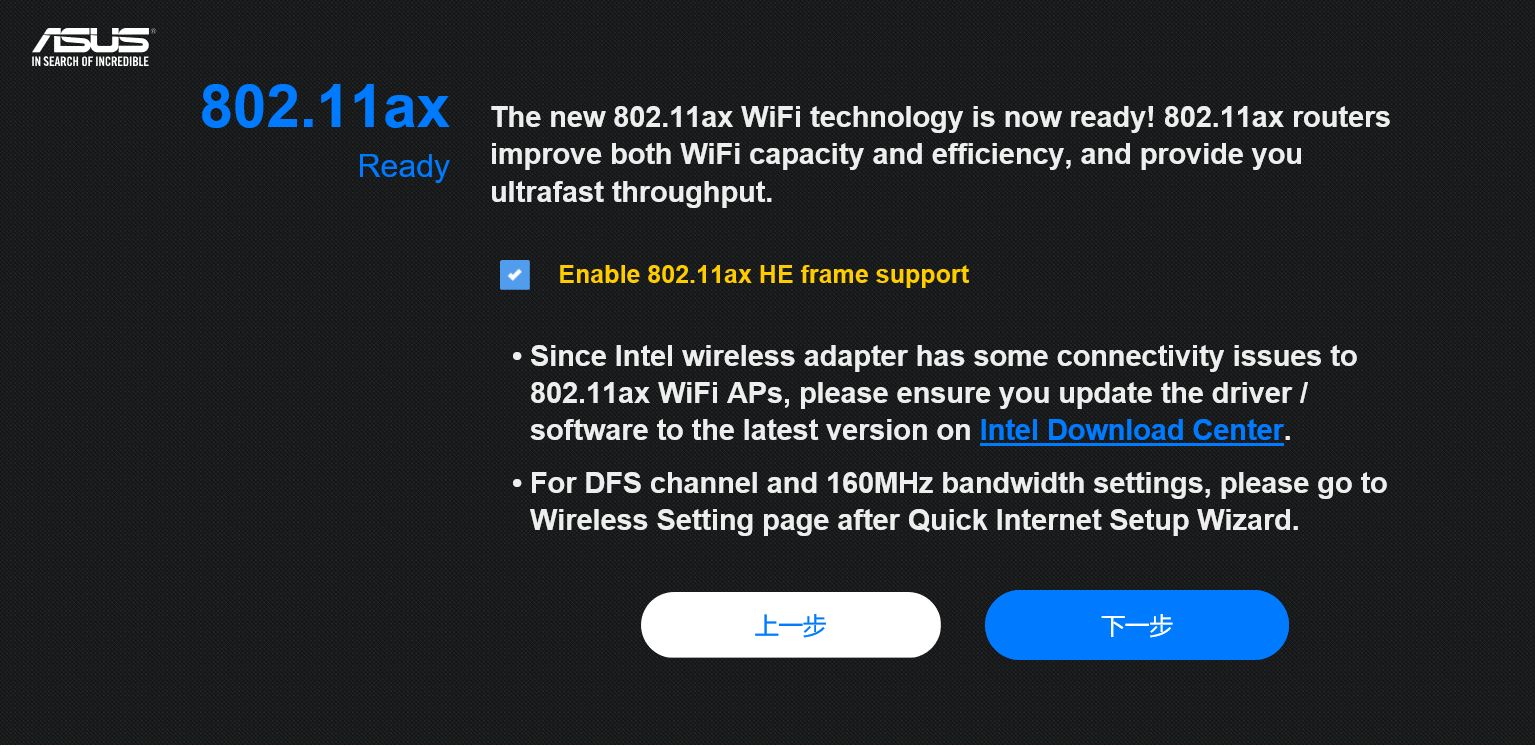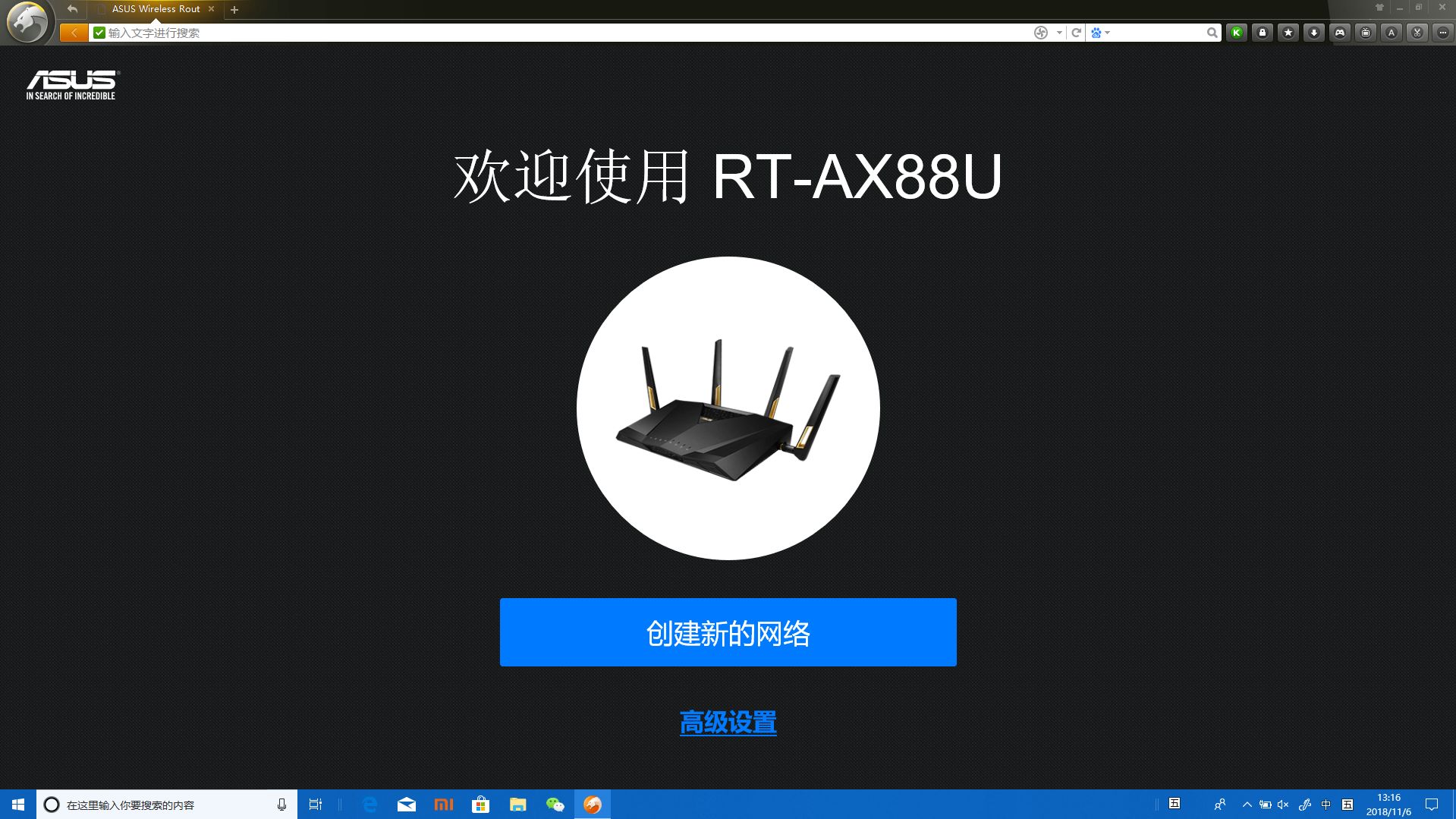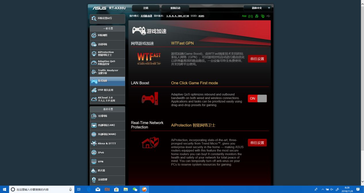 华硕RT-AX88U的路由设置界面为全简体中文版本,而且设置过程为每个功能一个界面的一步步独立操作,很顺畅也非常合理。