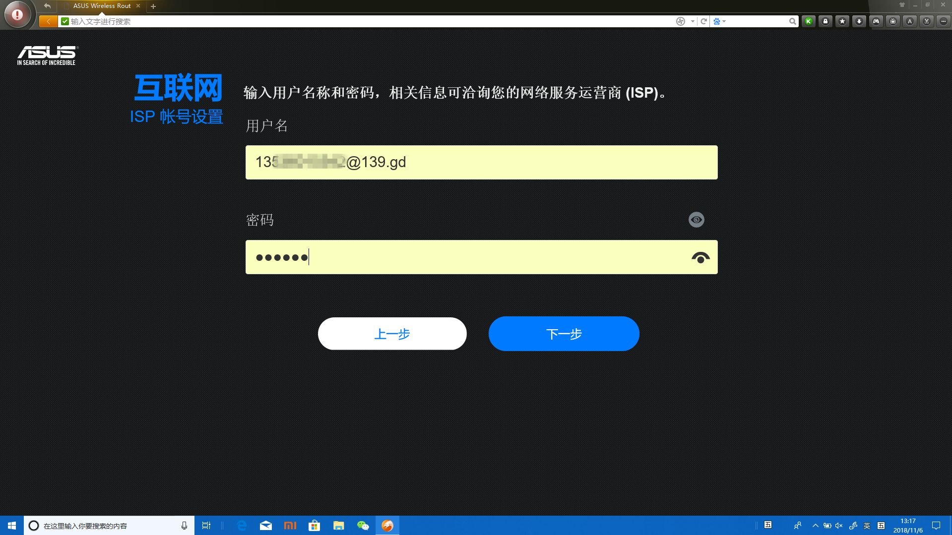 具体设置的第一步自然是输入自己的网络用户名和密码,这个是很容易忘记的,不过好在这个现在在客服都很容易找回。