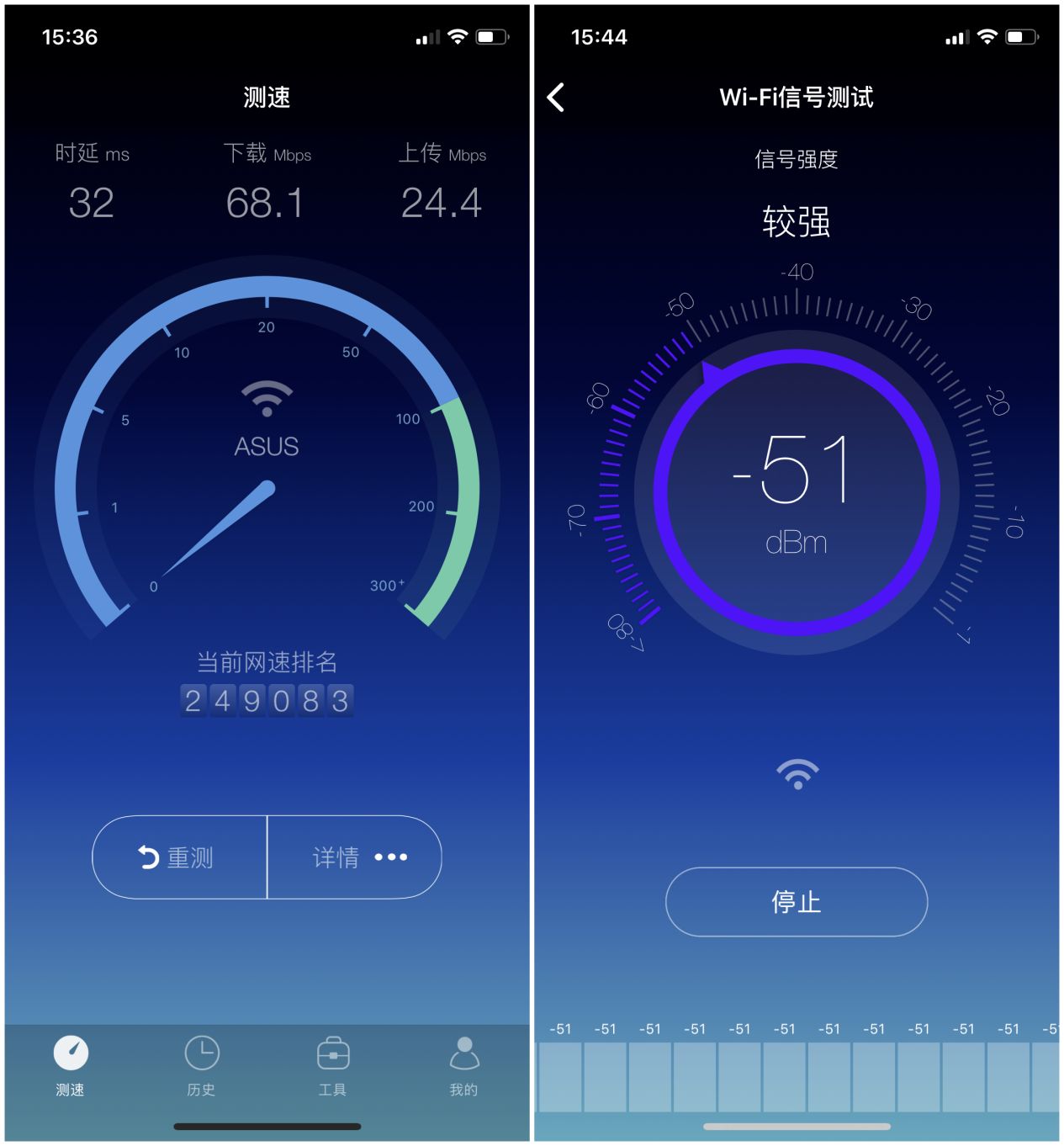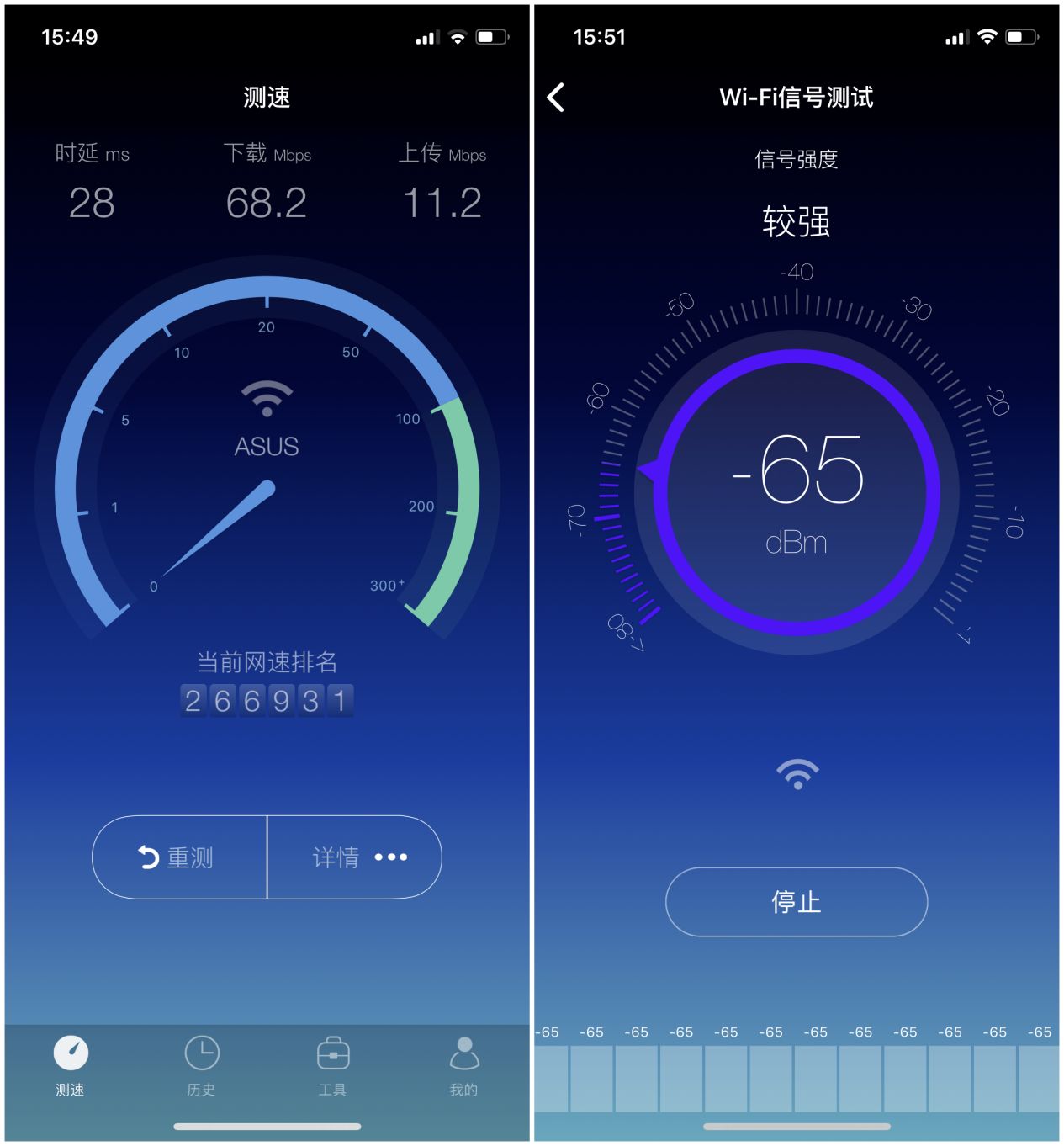 穿墙测试:在距离RT-AX88U一堵墙后的手机无线测试网速和强度。
