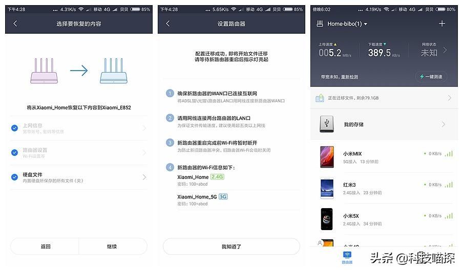 新老路由器的配置转移也变得非常的方便了,通过简单的连接,手机APP连接操作,根据提示进行,老路由器的配置很轻松的转移的新路由器上,不会因为更换路由器,从而再从头到尾对所有的联网设备进行配置。之前联网的设备都会无障碍连接到新的路由器上,极其的便利。