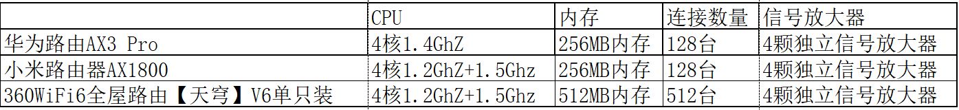 这三款路由器价格相同,不过就配置而言,360WiFi6全屋路由 天穹 V6略微给的多。内存512MB是另外两个产品的2倍,连接数量能力大,实际使用肯定是内存带来的实在。
