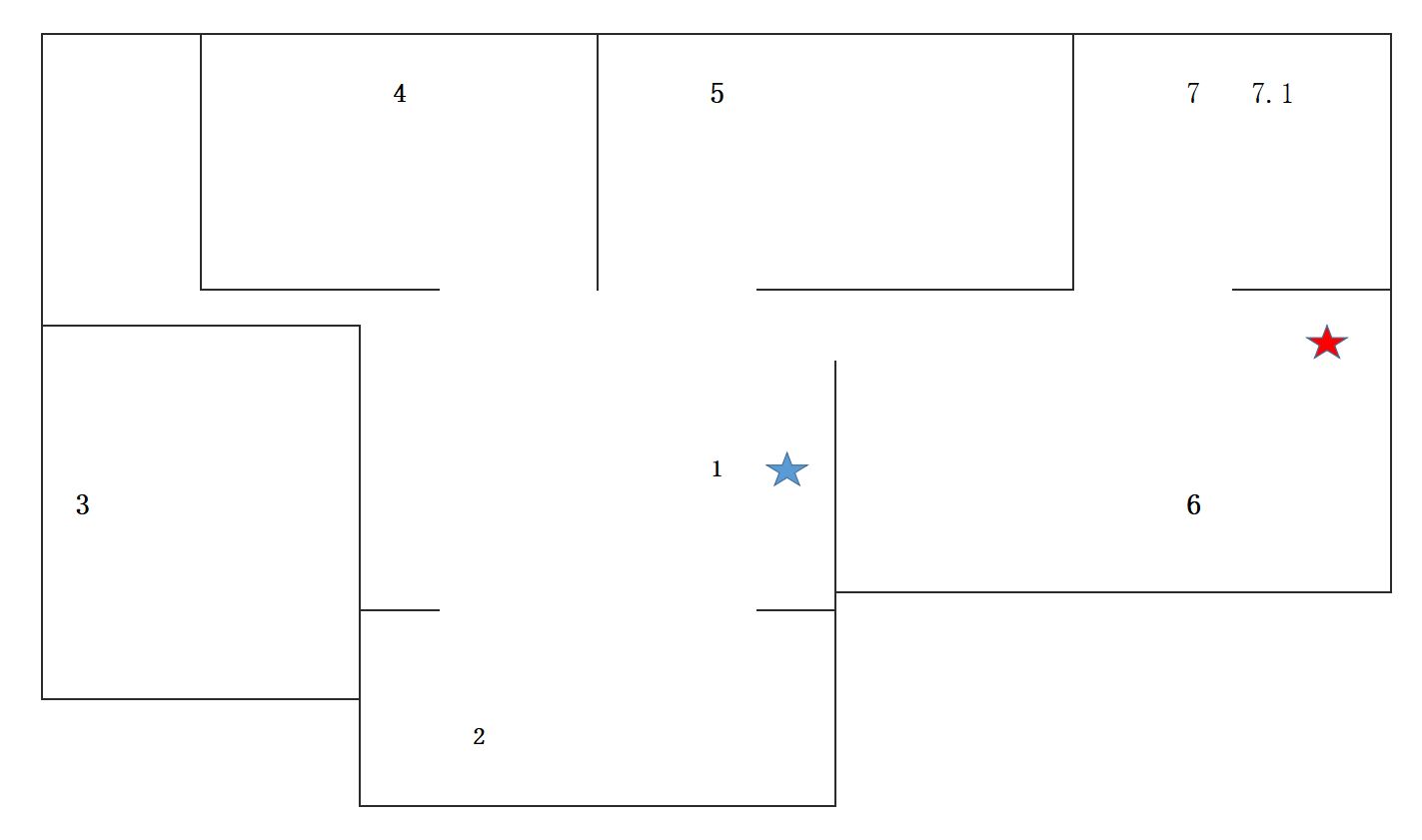 网络测速共计取点8个,其中1-7为单只路由器测试,7.1位置为双路由器测试。目的是检查单双路由器对于网速的影响。其中蓝色标记为主路由,红色标记为副路由(仅测试7.1位置时开启)。