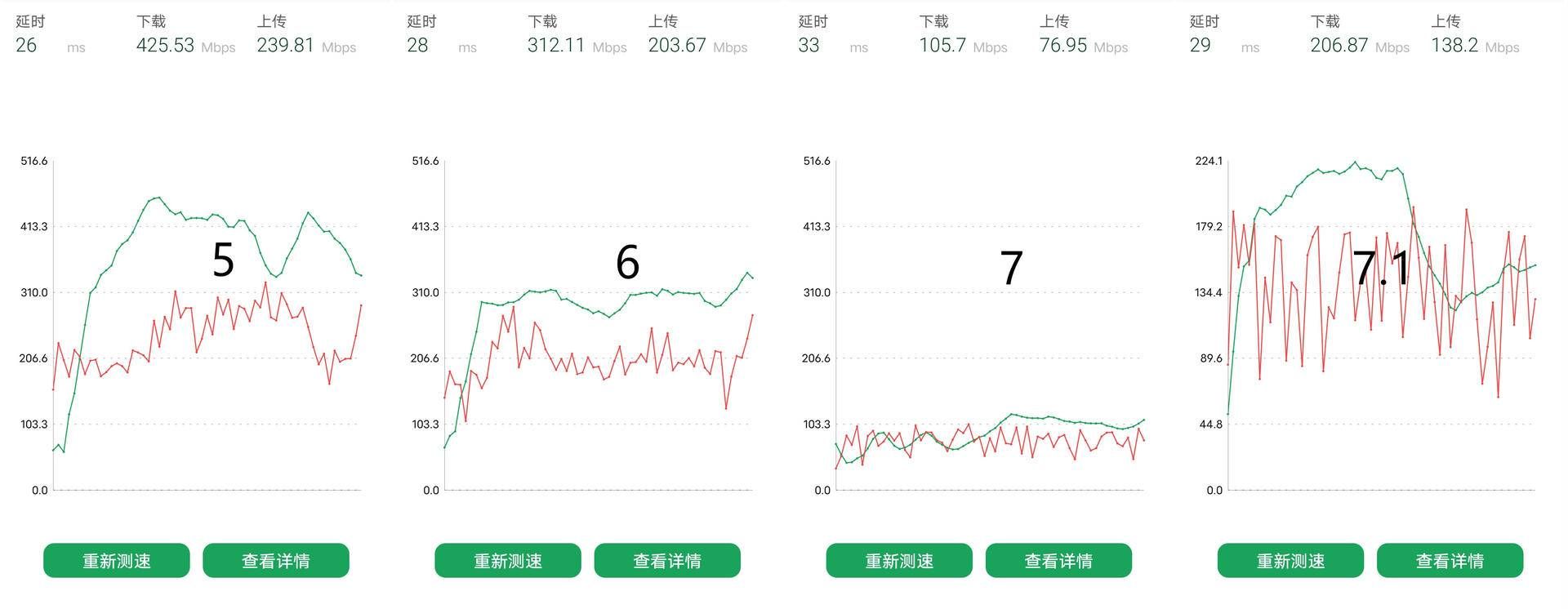 测试结果没有什么意外,距离越近网速越好。在最远的位置4,7都存在隔多层墙的情况,不过对于网速哪怕最差的位置7,依旧还有100Mpbs的网速,折合12.5MB/s,这对于手机、电脑上网也是完全够用的,延时30ms对游戏的影响也可以忽略不计。