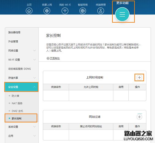 首先,进入路由器设置首页——点击“高级设置”——家长控制——点击“启用”(家长控制的总开关)——应用