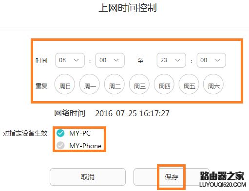 图标,选择需要控制的终端,并设置其允许上网时间段。单击“保存”。