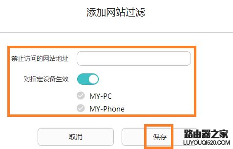 图标,选择需要控制的终端,并设置其禁止访问的网站。单击“保存”。