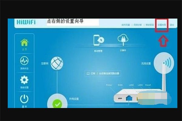 4、进入极无线路由器管理界面之后,再点击顶部右上角的“设置向导”将上网账号填写进去即可。