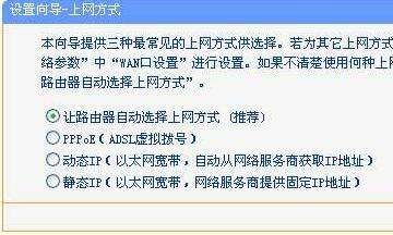 6、点击下一步,进入上网方式选择,一般来说,家庭式的网路在配置时,最好选择第一项:让路由器自动选择上网方式,如果是企业,有运营商提供的固定IP地址,则选择:静态IP。