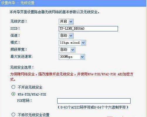 在这里如果需要使用无线功能,则要保证无线状态为开启,然后在ssid项目中,可以把无线信号名称修改成自己喜欢的名称,也可以使用默认名称,最后在安全选项中,先选中WPA-PSK/WPA2-PSK,然后在PSK密码输入框内输入密码,即无线信号的密码,当然也可以选择不设置密码。那样会造成别人蹭网行为,不建议不设置密码。