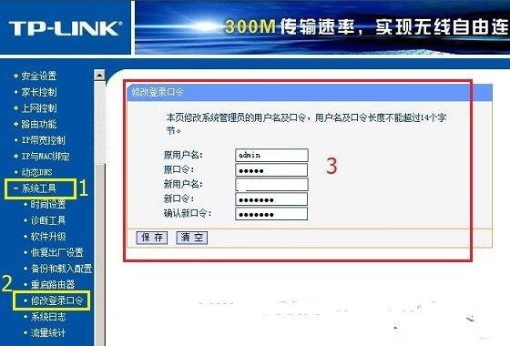 登录到路由器的设置页面之后,在左侧列表中找到系统工具—修改登录口令,然后在右侧页面中,先填上原来的用户名和口令,然后在设置新的用户名和口令,最后点击保存即可。