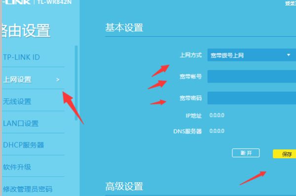 5、在出现的上网设置界面选择上网的对应方式,如拨号上网。输入网络运营商提供的账号和密码点击保存按钮。
