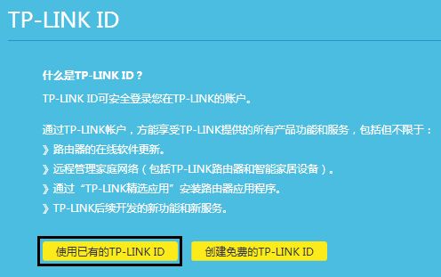 3.登录路由器管理界面后,点击路由器主界面下方的 路由设置 >> TP-LINK ID,进入TP-LINK ID设置界面,点击 使用已有的TP-LINK ID,如下图: