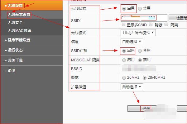 4、点击进入“无线基本设置”页面,进行无线网络的一些基本设置,最后点击“保存”按钮。
