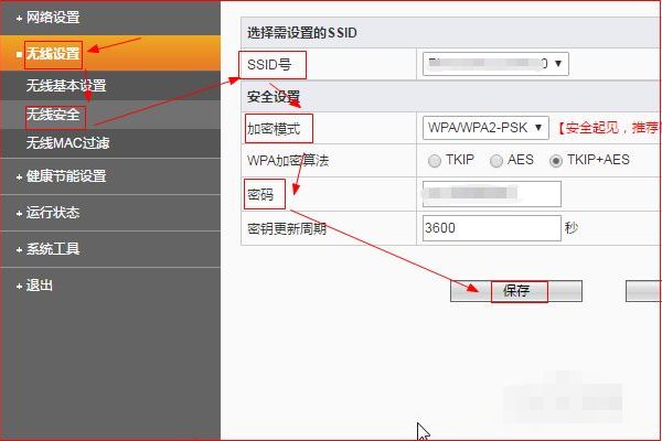 5、接着点击无线设置下方的无线安全按钮,进入无线网络安全功能的配置。设置完成点击保存。