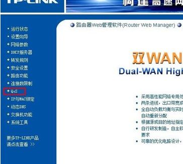 1、进入到路由器设置页面,在页面左边的功能目录中可以看到有QoS一项,点击进入;