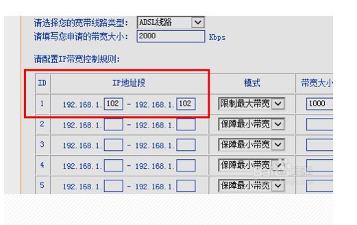8、再在下面的规则中填写要控制的IP和带宽大小,同时也设置自己的电脑“保证最小带宽”,并且全部选择“启用”。