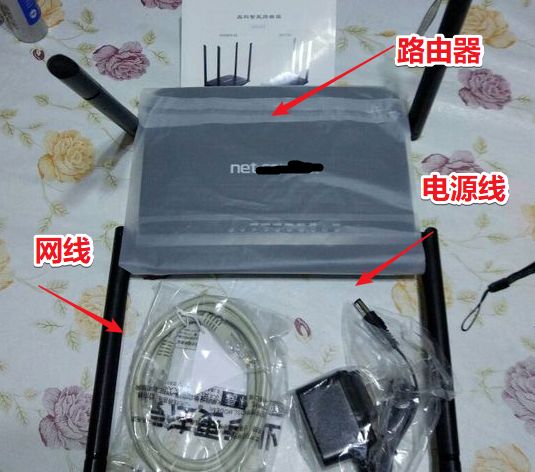 1、基本上所有的路由器连接都需要下图所示的配件——路由器、网线、电源线。