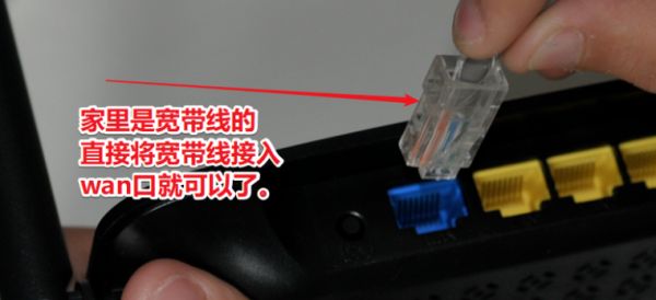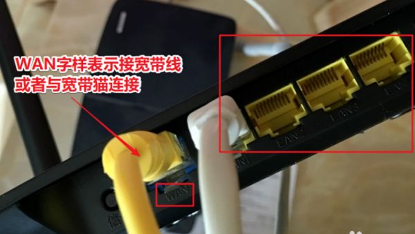 3、接下来就是将宽带线(或者猫)与路由器进行连接,需要注意连接的是路由器的WAN口,上面有WAN的字样提示。