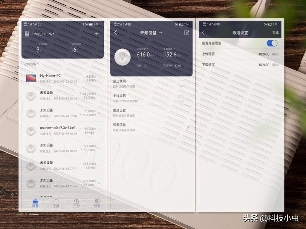设备管理页面中,则可以随时查看下挂设备的实时网速,及时发现下挂设备的异常流量,从而实现一些特殊功能诸如联网权限,上网限速等供,还是非常便利的。实际上AX3000后羿路由器标配512M 超大内存,64G eMMC存储(边缘计算用),可稳定连接253台终端设备,因此无论家用还是小型SOHO办公使用,都能完美应对。