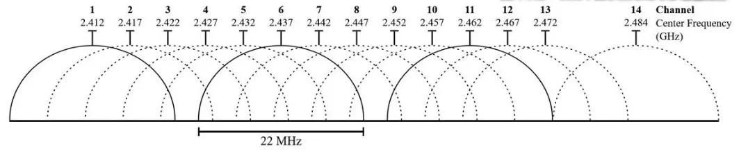 整个2.4GHz Wi-Fi频率从2.4GHz到2.5GHz只有100 MHz宽。每个2.4GHz Wi-Fi通道的宽度为20 MHz。但由于100个通道不能分为14个大小相同的通道,因此各通道之间存在明显的重叠。事实上,在2.4GHz频谱上,只有三个Wi-Fi通道不完全重叠。频道1、6、11。
