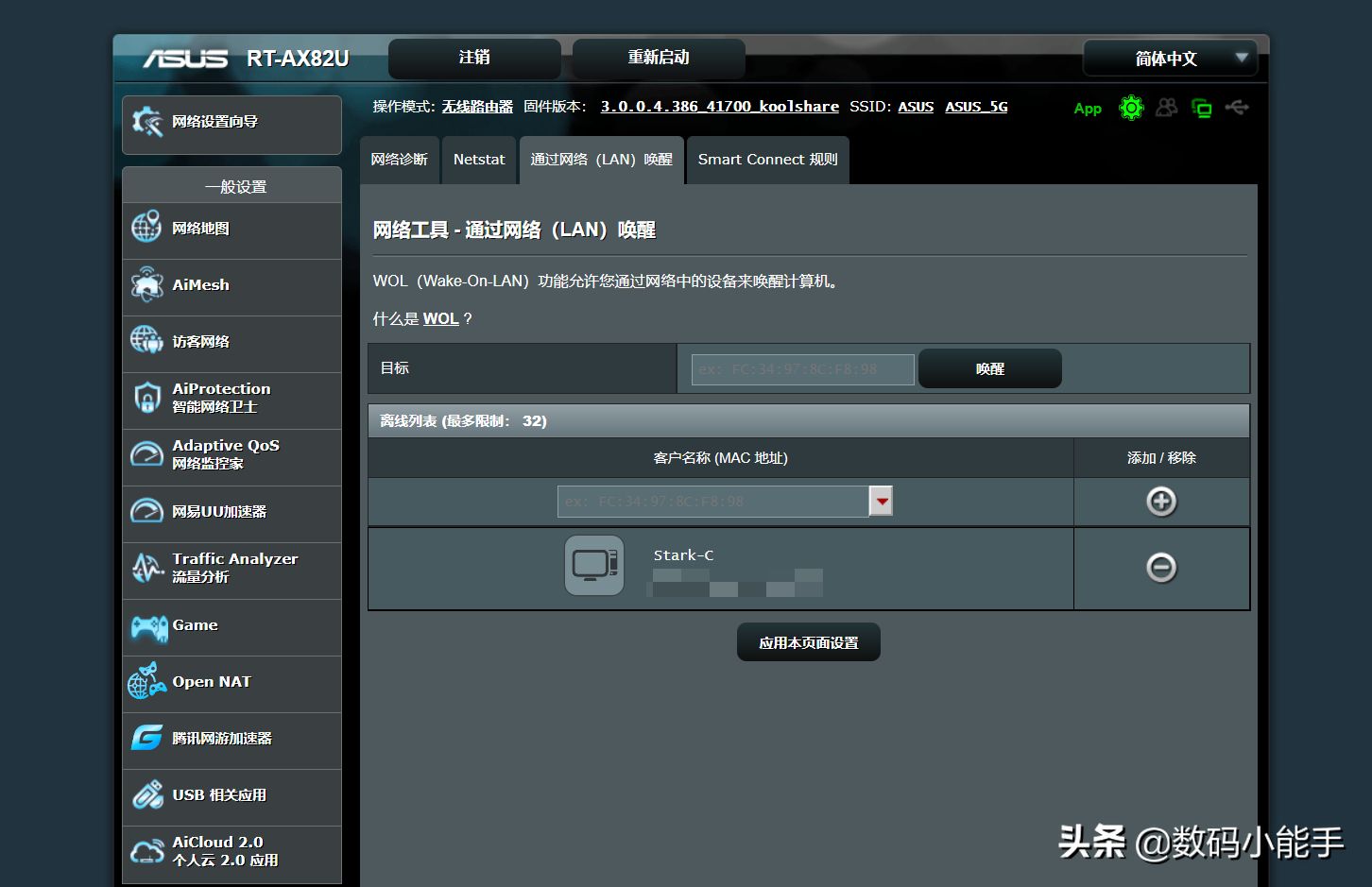目前绝大多数的路由器都有网络唤醒功能。比如说我今天所要演示的华硕路由器,网络唤醒的位置在“高级设置--网络工具--通过网络(LAN)唤醒”里面。