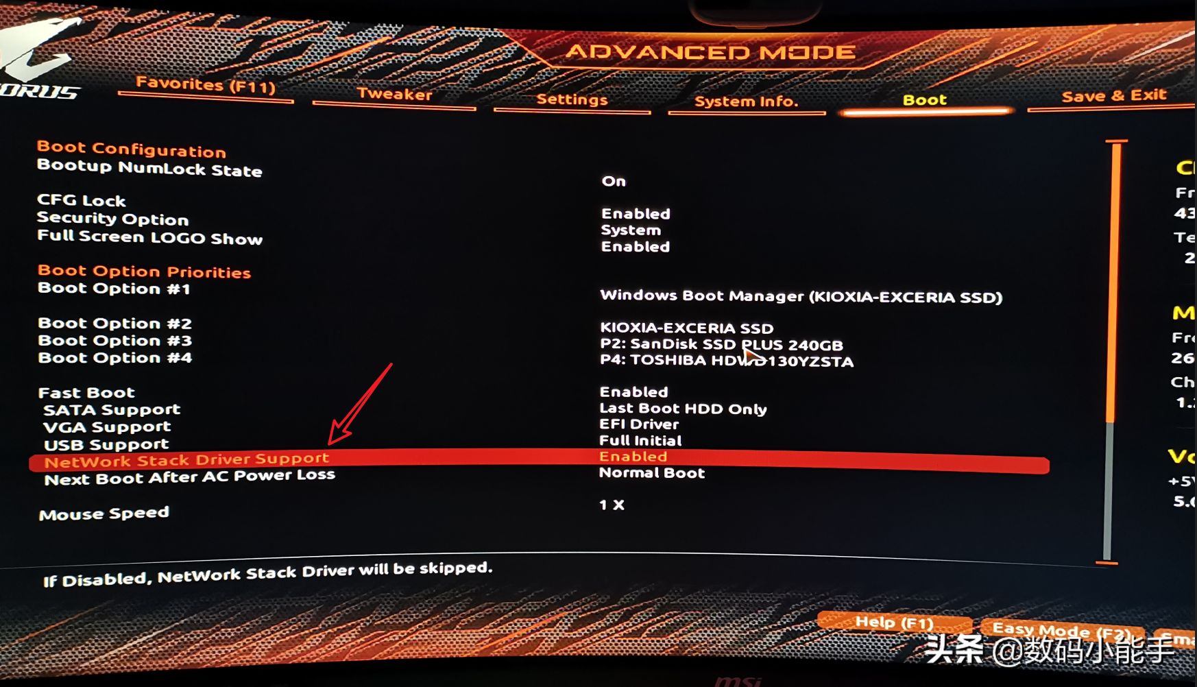 还需要在“Boot”里面的“Fast Boot”的“network stack driver support”开启,之后在将“Fast Boot”关闭。