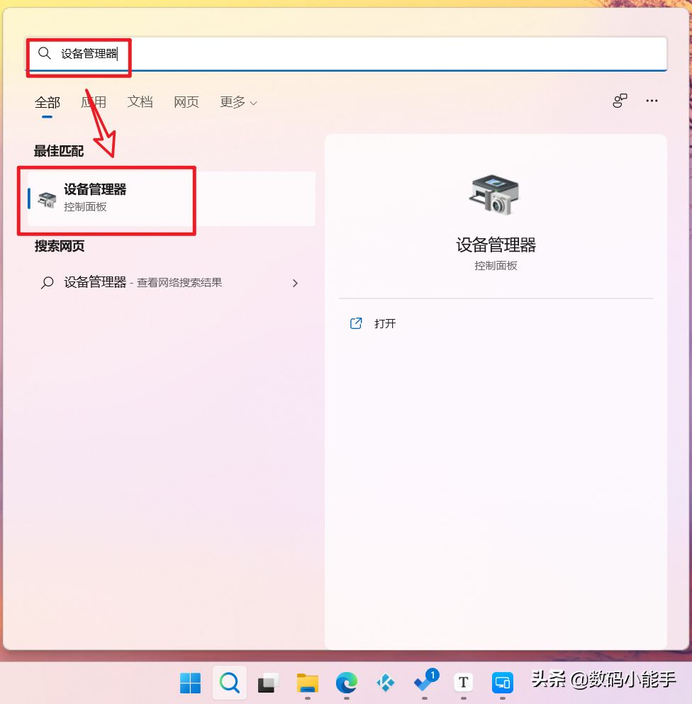 直接在电脑的搜索窗口搜索“设备管理器”,然后点击打开设备管理器