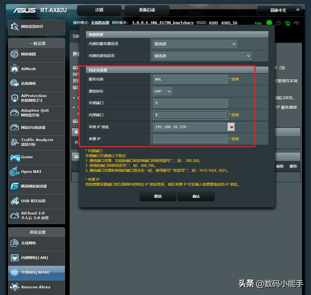 开启端口转发:简单来说就是新增一个 UDP 协议的端口,指向局域网内需要被唤醒的电脑的 IP,以确保公网的请求能到达最终内网的机器。因为我这边是公网IP的缘故吧,我这边实测不设置端口转发其实一样没有问题,不过为了速度快点,并且更安全,我们最好还是设置一下端口转发。