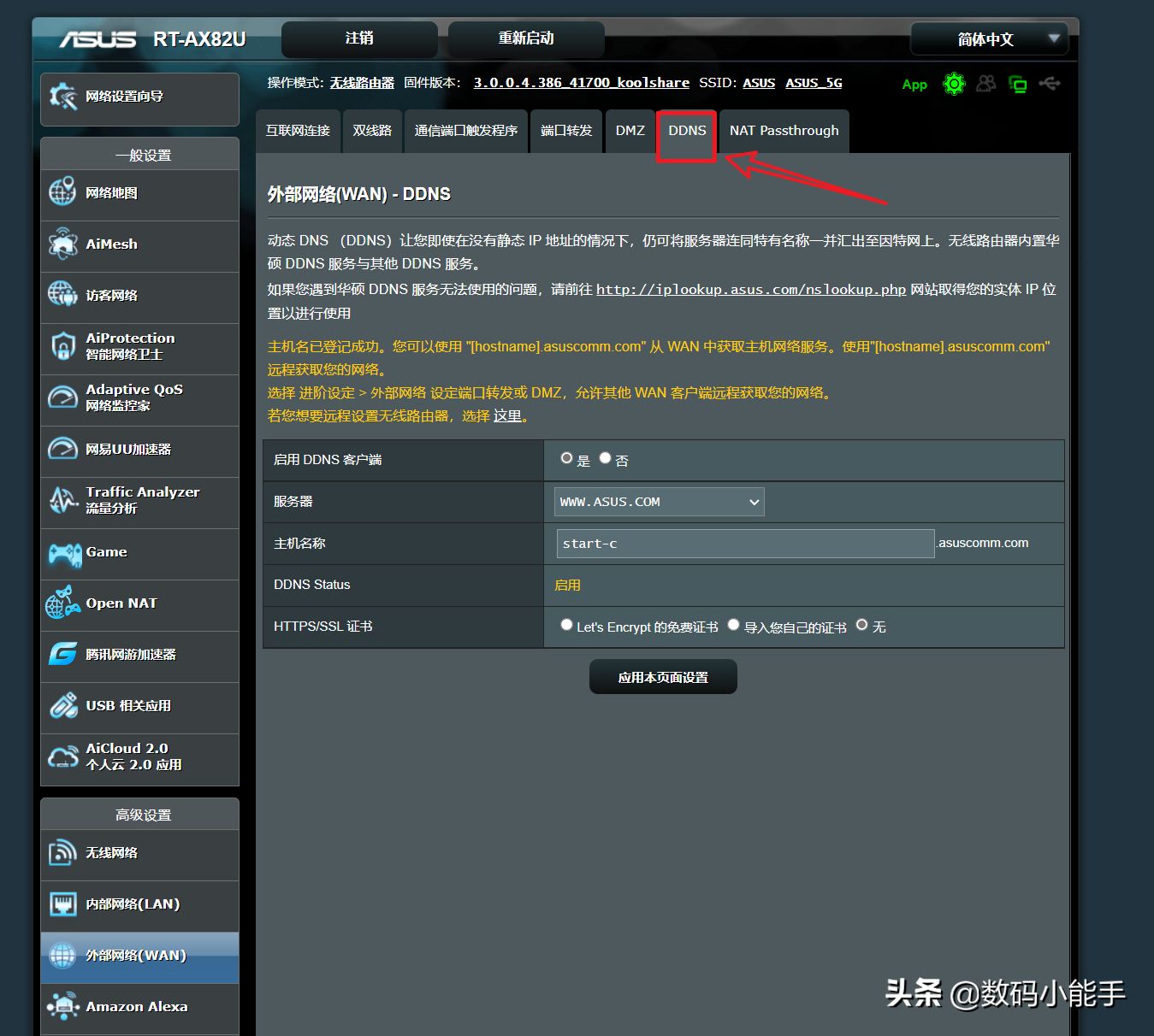 启用DDNS:这个是因为我们家用的宽带每天的公网 IP 都会变化,因此我们还需要设置一个 DDNS来获得一个固定的域名,只有这样,我们在广域网才可以顺利的访问家里的路由器并发送唤醒指令给电脑。