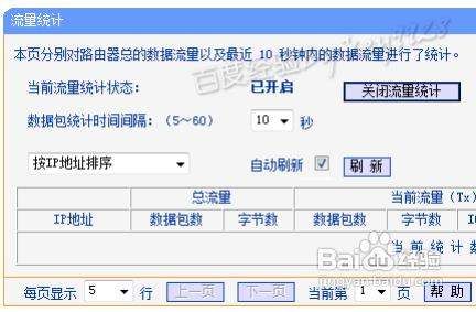 9、此时“当前流量统计状态”显示为“已开启”,“开启流量计统计”按钮也变成为“关闭流量计统计”按钮。我们勾选“自动化刷新”复选框,稍等一会,若有电脑在使用网络,则下面会有显示的统计信息: