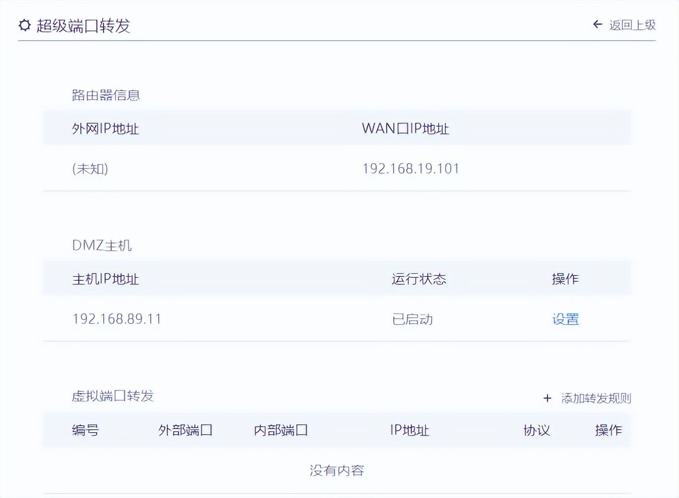 我现在有一台普通的家用路由器,其内网口IP为:192.168.89.1, 外网口IP为192.168.19.101,因为我上网的主路由器的IP是192.168.19.x网段。