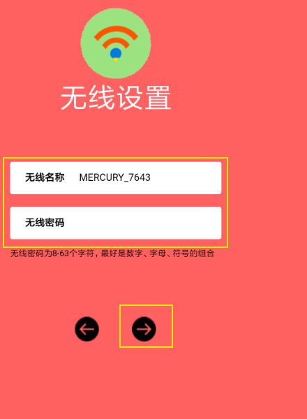 5、设置无线的名称和无线密码,设置完成后点击下方的箭头。