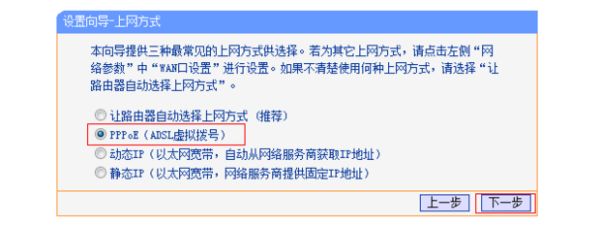 5、接下来选择上网方式,选择 PPPoE(ADSL虚拟拨号) ,点击"下一步"。