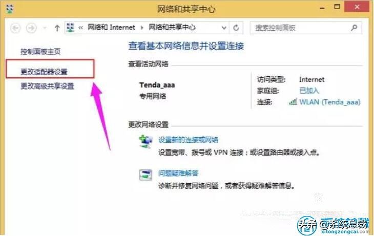 2、进到“网络和共享管理中心”,点一下左边“更改电源适配器设置”