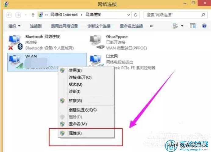 3、进到“网络连接”,右键点一下已经应用的网络(当地连接或是无线网WLAN),选择“属性”