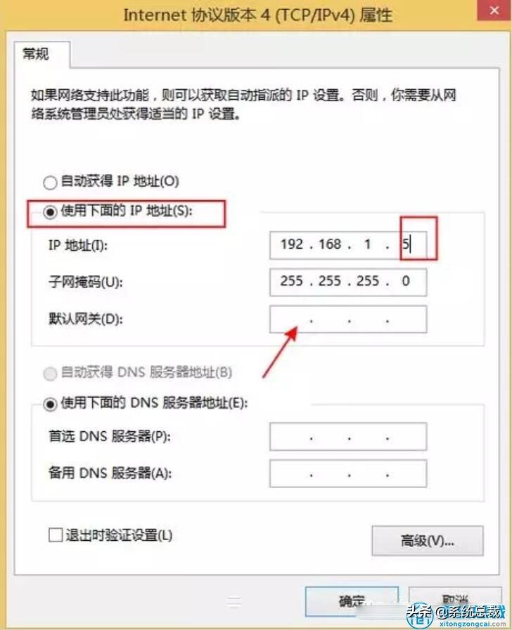 5、下面就看到了更改ip地址的窗口,这儿默认是自动获得ip地址,在“应用下面的IP地址”选项前边的圆形点一下,就可以手动式输入ip地址了,输入好自身必须的IP地址和dns后点一下确定就可以,这个时候电脑上的IP地址就更改成功了,默认网关ip一般设置为无线路由器的IP地址。