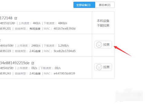 5、然后将不认识的人和不让用网的人拉入黑名单,去除蹭网的人,可以提高网速,定期去除一下,最好每次修改密码,如图所示。
