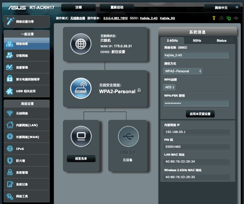 整个路由器的初始化引导十分人性化:你只需要修改基础的后台密码、填入拨号账号然后设置无线网络的广播ID即可完成。整个华硕RT-ACRH17路由器的后台均使用了最新版本的ASUSWRT用户界面,完全的中文以及可视化图形,后续想要调整设置也是一目了然。