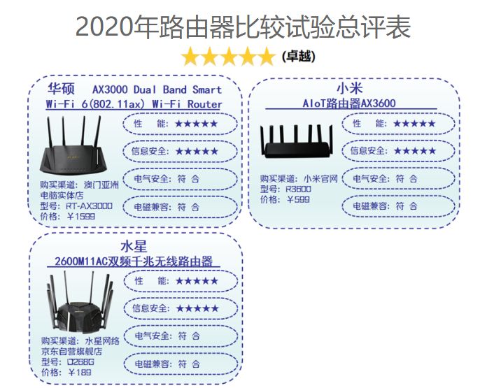 那么,路由器应该怎么选呢?7月13日,据深圳市消费者委员会官方网站报道,深圳市消费者委员会发布了《2020年路由器比较试验报告》,对华硕、小米、水星、华为等多款路由器进行试验,其中有三款路由器得了5星级评论,而有些只有3星评论,包括华硕的RT-AX3000,无线信息覆盖范围获得了五星,而吞吐量、无线网络稳定度获得了四星;第二款五星评价的是小米R3600,吞吐量获得了五星,无线信号覆盖范围和无线网络稳定度获得了四星;第三款五星的路由器是水星D268G。