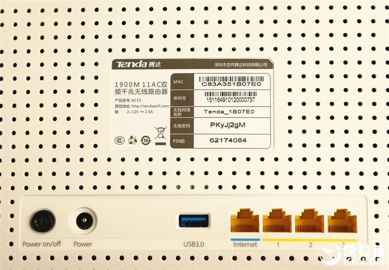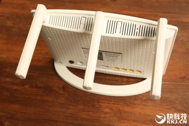 ↑↑↑背面使用了镂空小圆孔设计,便于散热,此外路由器的所有接口都集中在了背面。
