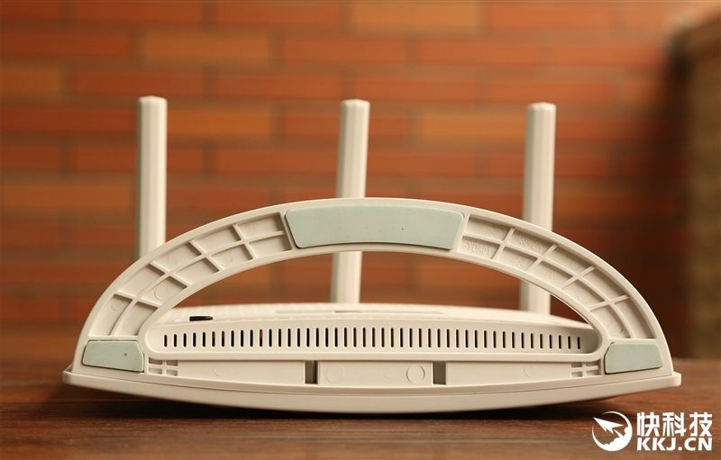 ↑↑↑腾达AC15采用了竖立的摆放方式,底座为半圆弧样式并带有一定倾角,还带有三处防滑脚垫确保路由器竖立摆放时的稳定性。此外竖立的摆放方式对路由器的整体散热也要优于平放。