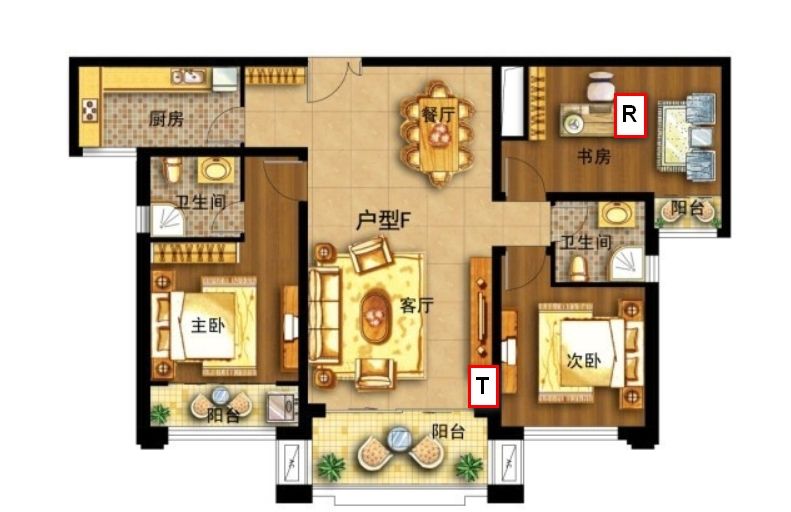 ↑↑↑户型示意图,其中T位置为AC15路由器,R位置为信号接收端。