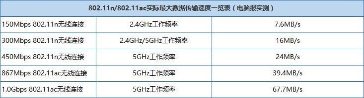 ↑↑↑802.11n/802.11ac实际最大数据传输速度一览表(电脑报实测)