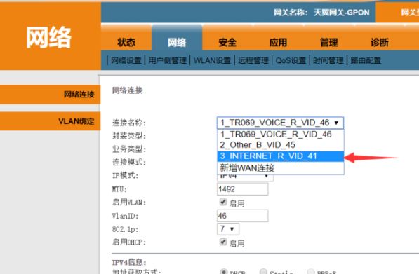 6、第1个需要设置的就是连接名称,我们设置连接名称选择为第3个,internet,41连接。