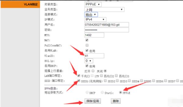 10、第5个我们设置vlanID为41,lan端口绑定为千兆,ssID端口绑定为无线网络,然后地址获取方式为pppoe,然后点击保存应用即可。
