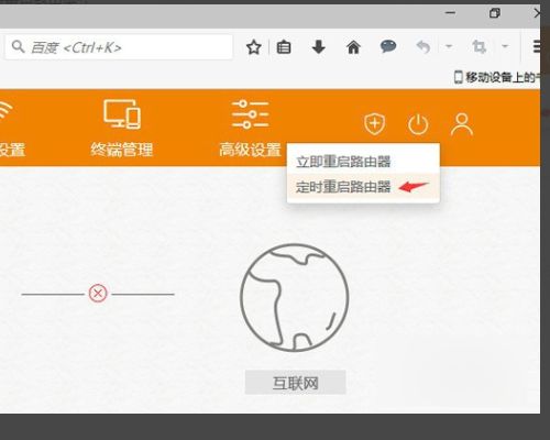 1、使用火狐浏览器访问斐讯K2管理面板,选择右上角“电源”图标下的“定时重启路由器”。