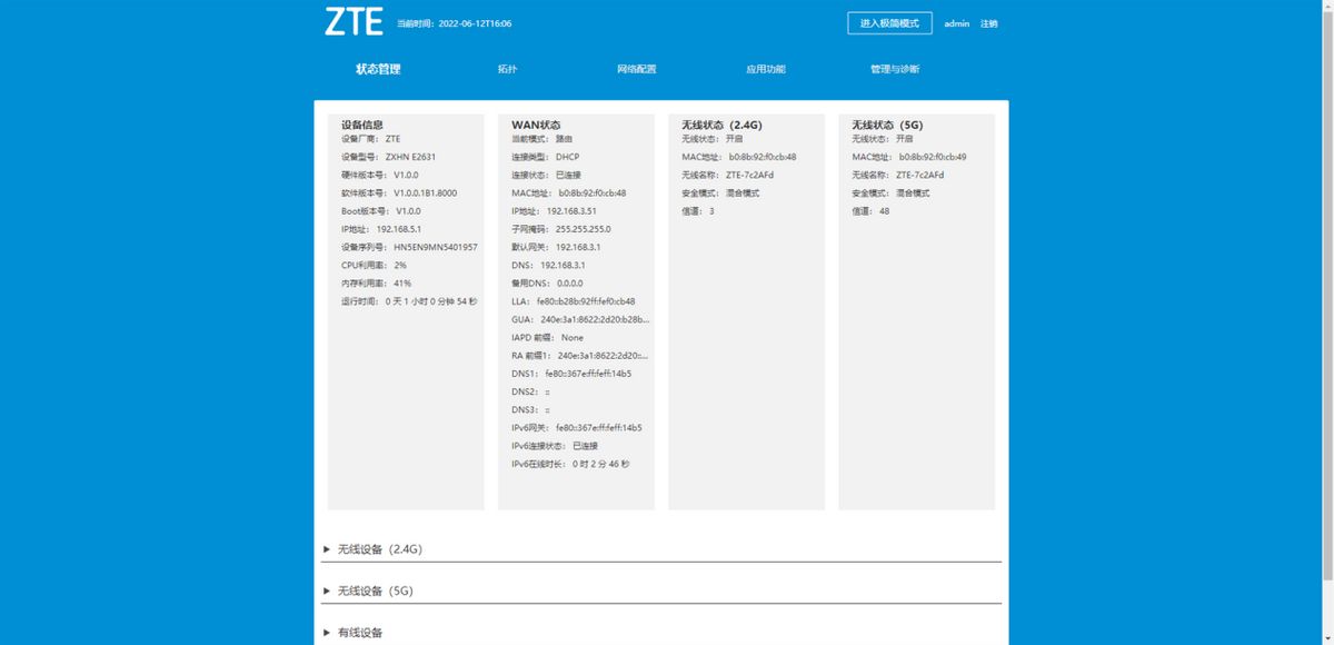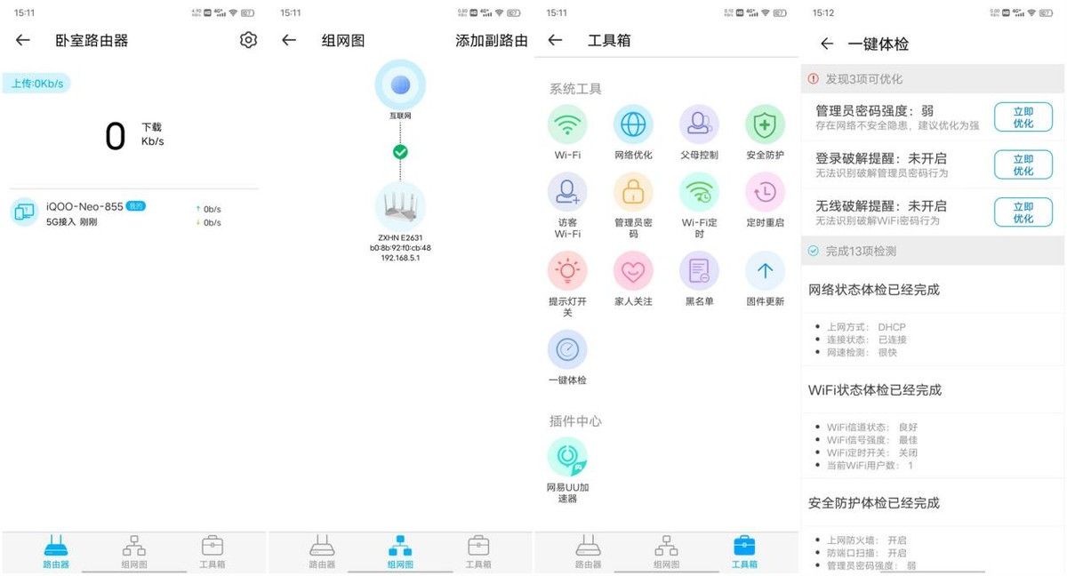 作为一款智能路由器,中兴AX3000巡天版同样有app支持。在app中,我们可以组网、设置WiFi、访客WiFi等,满足了用户的基本操作需求。AX3000的一键体检功能非常好用,有点类似电脑的360安全卫士,即使不懂路由器的用户也可以根据体检结果优化,非常省心。