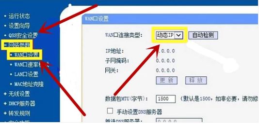 3、在左边的网络参数里找到WAN口设置,然后选择“动态IP”然后保存;