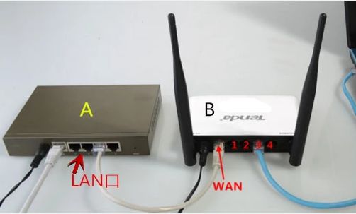 5、将A连接上电脑,重启路由器B,然后再找一根网线连接上路由器A的LAN口和B的WAN口,这样只要A可以上网,路由器B就可以上网。