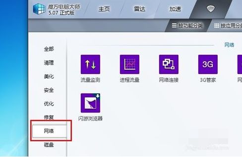 2.下载完成后启动魔方电脑大师,在主界面点击界面顶部的“功能大全”,然后在功能大全界面的左侧定位到“网络”,如图所示。